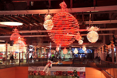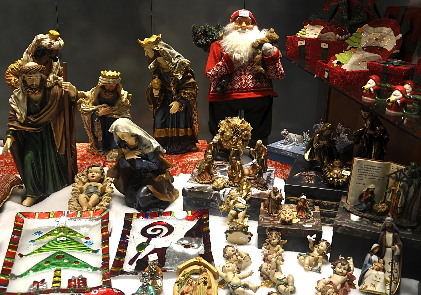 можно увидеть огромное количество ёлочных украшений, еловые и эвкалиптовые ветви, ремесленные изделия, фигурки для рождественских вертепов,