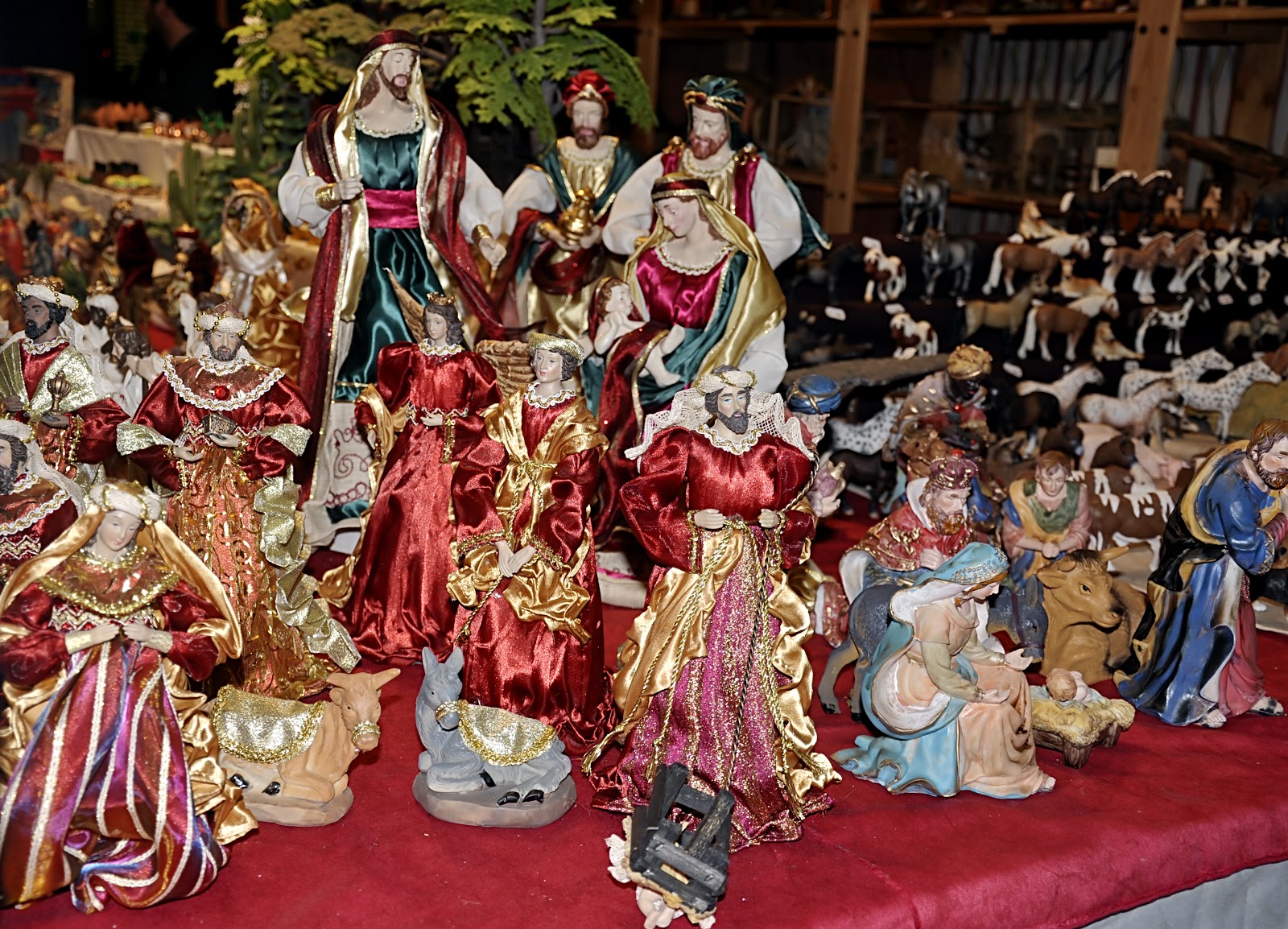 можно увидеть огромное количество ёлочных украшений, еловые и эвкалиптовые ветви, ремесленные изделия, фигурки для рождественских вертепов,